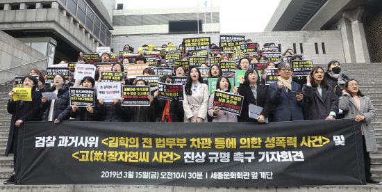3월 15일 서울 종로구 세종문화회관 계단에서 열린 '검찰 과거사위원회의 김학의 전 법무부 차관 등에 의한 성폭력 사건 및 고 장자연씨 사건 진상 규명 촉구' 기자회견. 뉴시스