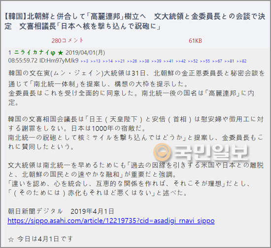 만우절을 맞아 일본 커뮤니티에서 혐한 성향의 가짜 뉴스들이 판을 치고 있다. 만우절 기사는 보통 가볍게 웃어넘길 수 있는 수준이어야 하지만 일본의 가짜 뉴스는 증오와 차별로 가득하다.
