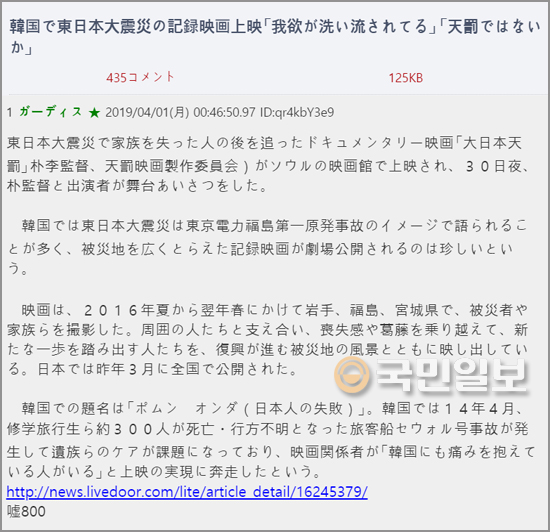 이 기사는 아사히신문의 31일 기사를 살짝 바꾼 것이다. 원래 재일교포 3세 윤미아 감독의 영화 ‘봄은 온다(일본명 一陽来復)’가 한국에서 개봉했다는 소식인데 가짜 뉴스는 영화 제목을 ‘천벌’이라고 바꿨다. 한국인들이 동일본대지진을 ‘천벌’로 여기고 있다는 거짓된 정보를 악의적으로 퍼뜨리는 셈이다. 거짓 기사 말미에는 ‘거짓말’이라고 작게 적혀 있다.