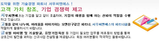 중소기업에 대한 각종 정부지원사업의 경륜과 전문성을 가진 국내 최고 수준의 컨설턴트가 연구소 설립부터 벤처, 이노비즈, 기술개발 정책자금, 신기술 인증 신제품 인증 등 각종 인증 및 수상 까지 우리기업이 기술경영 기반을 마련하고 도약할 수 있도록 체계적이고 종합적으로 지원해 드리고 있습니다.